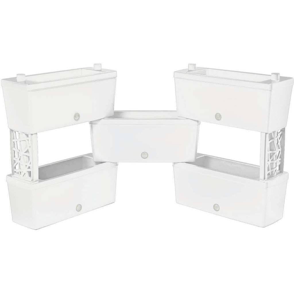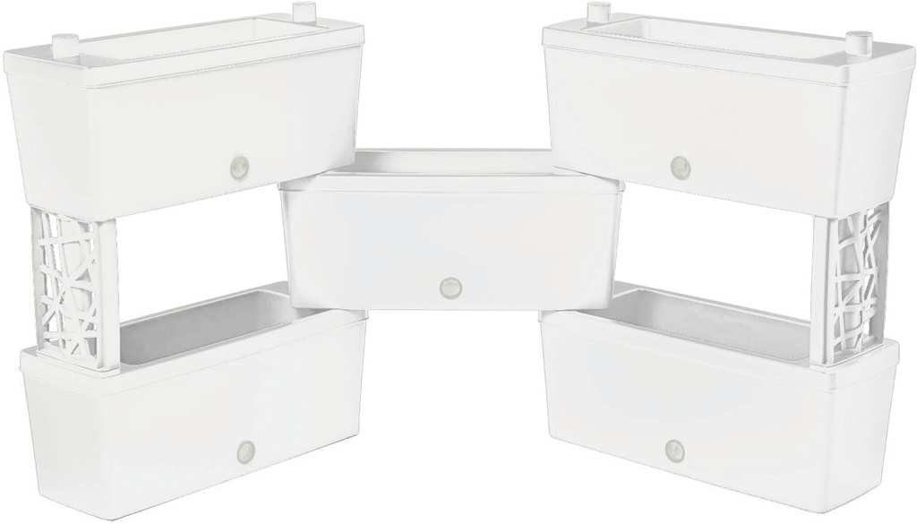 Realizzato con resine certificate e atossiche 100% riciclabili, resistente agli sbalzi di temperature, agli urti e ai raggi solari. Kit di cinque fioriere rettangolari modulabili e collegabili tra di loro, ideale per interni ed esterni, completo di sistema di auto irrigazione a vasi comunicanti e indicatori di livello acqua.