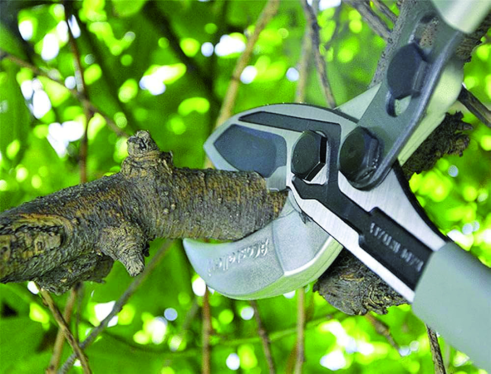 Manici in alluminio estruso anodizzato con manopole anti-scivolo, lama dritta in acciaio forgiata a caldo, contro-lama in alluminio, movimento assistito, completamente intercambiabile e regolabile. Adatto alla potatura di qualunque pianta con rami fino a Ø mm. 45.