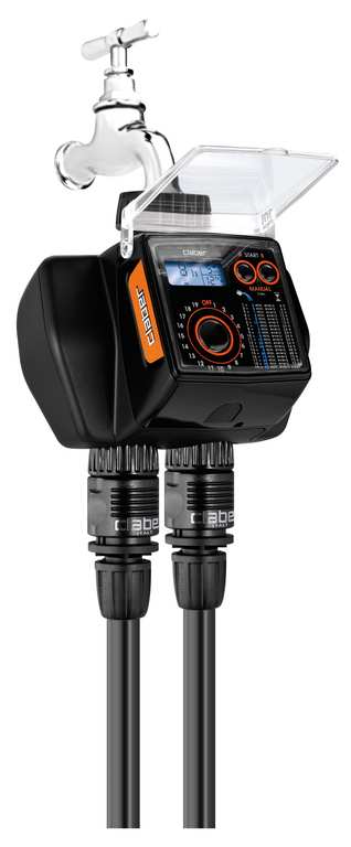 Automatico, 19 programmi prefissati per ciascuna linea, con display e 3 tasti, filtro lavabile, funzione di partenza immediata o ritardata 1-23 ore, coperchio trasparente di protezione, pressione di esercizio 0,2÷12 bar, collegabile con il sensore di pioggia RAIN SENSOR, funziona con due batterie stilo 1,5V (non incluse).
