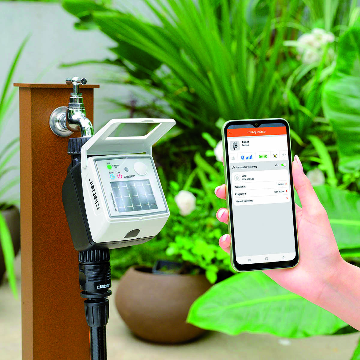 Programmatore automatico a rubinetto ad energia solare, irrigazione su linee indipendenti, facilissimo da programmare attraverso tecnologia Bluetooth e app myAquaSolar, pannello fotovoltaico integrato, 2 programmi totalmente personalizzabili, programmazione settimanale con esclusione dei singoli giorni, funzione di programmazione manuale, pressione di esercizio 0,5÷10 bar, attacco rubinetto 3/4, filtro lavabile, collegabile al sensore di pioggia Rain Sensor.