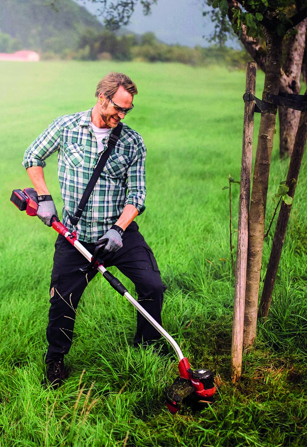 Motore Brushless, doppio alloggiamento per batterie, telaio in acciaio, 2 velocità, bobina filo mt. 8 con testina automatica per riavvolgimento rapido, impugnatura supplementare antiscivolo regolabile, doppio manubrio pieghevole, dispositivo di sicurezza Flowerguard per la protezione di fiori e piantine. In dotazione: tracolla regolabile, senza batteria e caricabatteria.