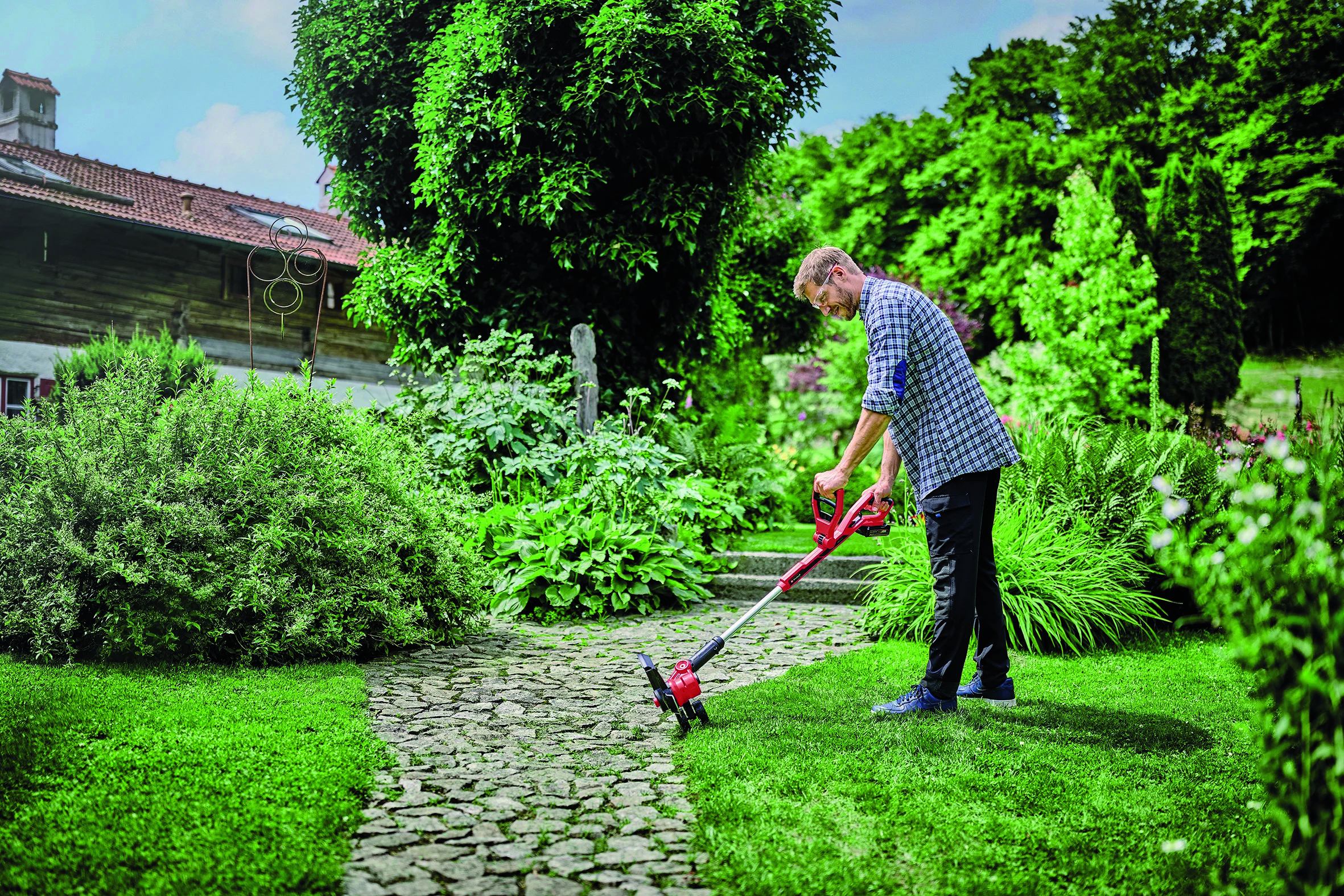 Testa motore girevole a 90° per tagli su superfici verticali/bordi, asta telescopica regolabile, bobina filo mt. 5 con testina automatica per riavvolgimento rapido, impugnatura supplementare antiscivolo, rotella di guida per lavorare con precisione sui bordi, testina motorizzata regolabile su 3 posizioni, senza batteria e caricabatteria.