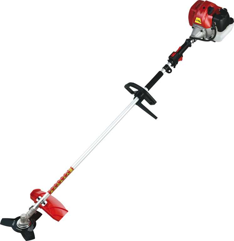 Antivibrazione, impugnatura a delta, quick start, primer sul carburatore, asta in alluminio cm. 150. In dotazione: testina a 2 fili in nylon, lama a 3 denti, tanica, cinghia di sostegno.