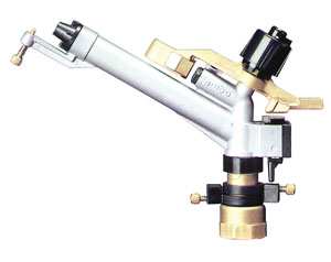 In ottone e polipropilene, 2 getti, ugelli intercambiabili Ø mm. 8÷18, gittata max mt. 29, superficie max irrigata mq. 2.640.