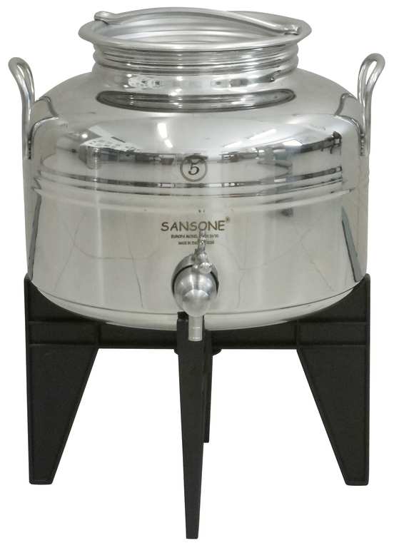 In acciaio inox 18/10, tappo con guarnizione siliconica, valvola di sfiato sul coperchio, rubinetto in acciaio inox antigoccia, saldato testa a testa, supporto in pvc in omaggio.