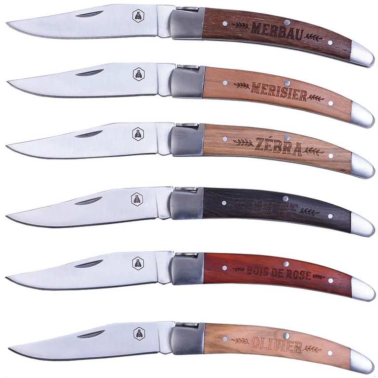 6 coltellini pieghevoli assortiti con lama in acciaio cm. 8,5, manici in legno cm. 10,5, confezione espositiva in legno e plexiglass.