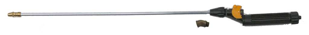 Manico in plastica, ugello regolabile, completa di raccordo curvo.