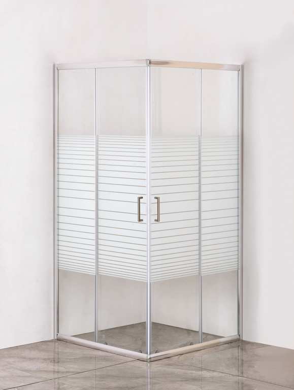 Profilo in alluminio cromato, profilo di compensazione cm. 1, pannelli in vetro temperato serigrafato spessore mm. 5, maniglia cromata, guarnizione magnetica waterproof, apertura scorrevole su rulli in ottone.