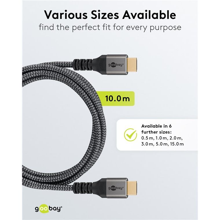 La serie Goobay Plus con spine dal design sottile ed elegante in metallo in colore Sharkskin Grey. Il cavo universale HDMI fornisce una trasmissione audio e video cristallina e ad alta risoluzione e può funzionare anche come cavo di rete tra due dispositivi abilitati HDMI.