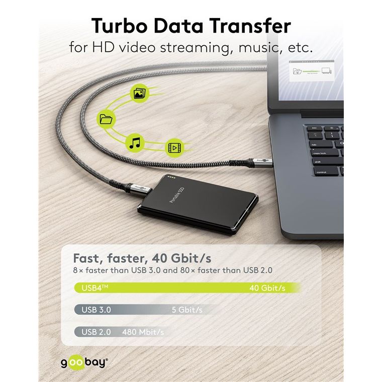 Fino a 40 Gbit/s per trasferimenti di dati fulminei, che rende il cavo USB-C 8x più veloce dell'USB 3.0 e perfetto per i dischi rigidi NVMe, i film in HD, le serie, la musica e le foto