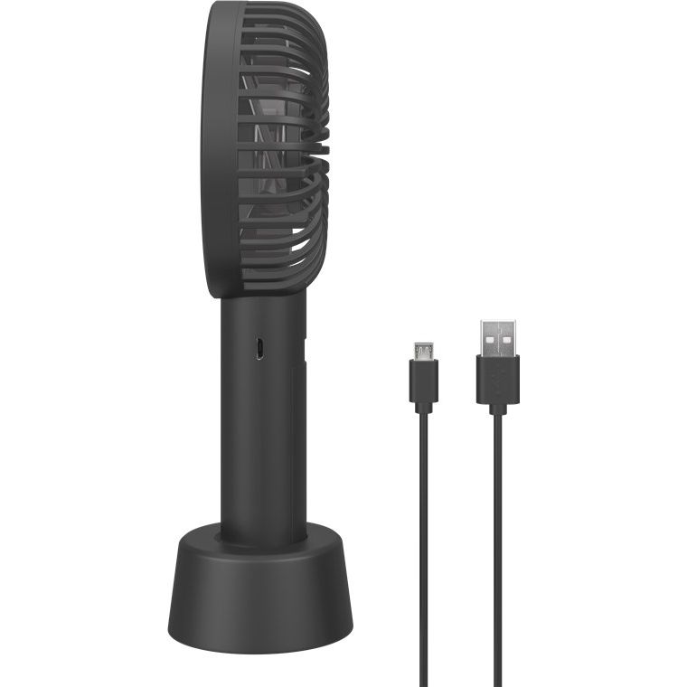 Il ventilatore piccolo viene fornito con un pratico supporto, un cavo di ricarica USB e un cinturino da polso.