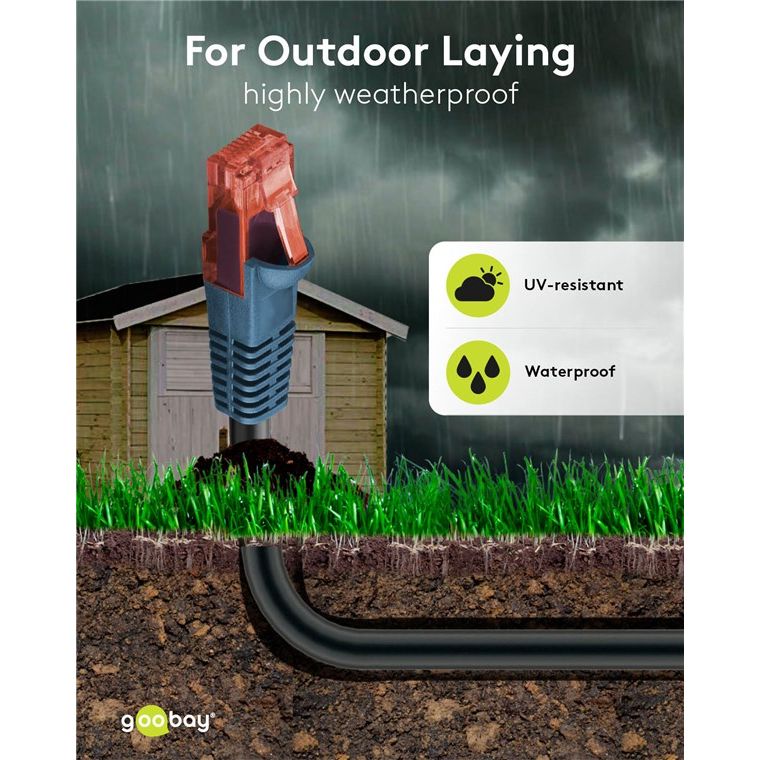 Il cavo di rete di Goobay è ideale per l'installazione all'esterno, ad esempio in giardino, per il campeggio, sulle facciate degli edifici, sul balcone e per collegare le telecamere di sorveglianza. La guaina del cavo in polietilene a doppia protezione è estremamente resistente agli agenti atmosferici e ai raggi UV.