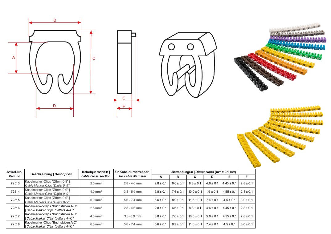 Marcatori a clip per cavi Lettere A-C, per cavi con un diametro massimo di 5,6 - 7,4 mm