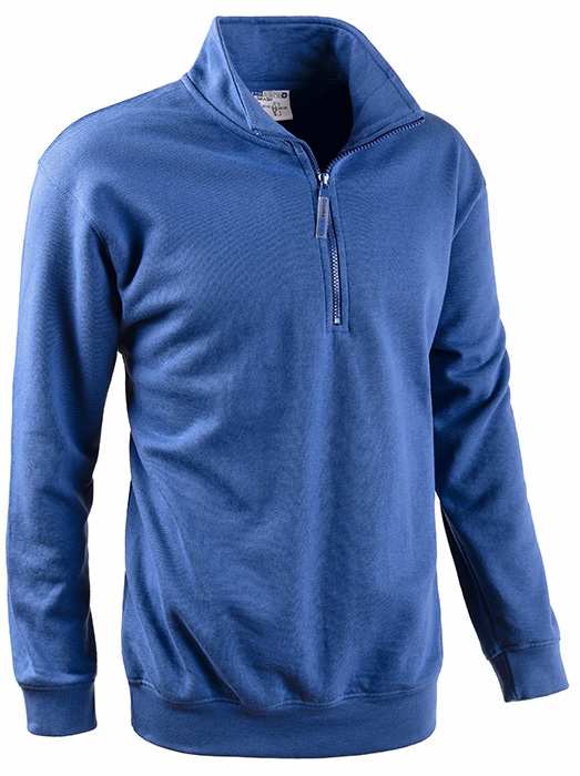 65% cotone e 35% poliestere, chiusura centrale mezza zip, fascia parasudore interna al collo, elastico ai polsi ed in vita.