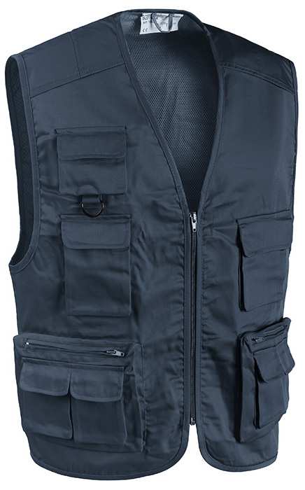 80% poliestere e 20% cotone, 8 tasche esterne, 2 tasche posteriori, porta-badge estraibile, retinatura interna.