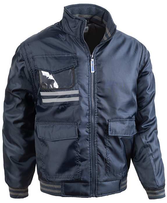 100% poliestere Oxford spalmato PU, foderato internamente, chiusura con cerniera, maniche staccabili, giromanica con elastico frangivento, 4 tasche esterne (1 porta-badge) e 1 interna, Rib sul collo e in vita.