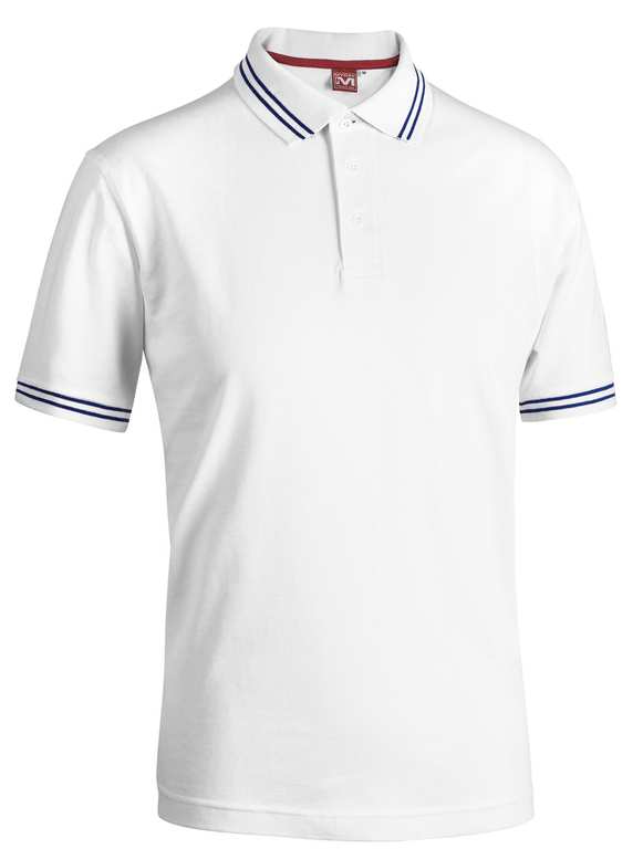 In cotone Piquet 100%, bordo manica a coste, spacchetto laterale sul fondo, righe a contrasto sul colletto e a bordo manica.
