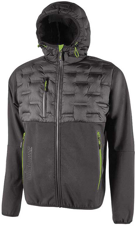 96% poliestere e 4% spandex, fodera interna in nylon e micropile, chiusura centrale con zip impermeabile, cappuccio fisso e regolabile, polsini elasticizzati, 3 tasche con chiusura zip (2 frontali + 1 sul petto), fondo sagomato, piping fluo sulla schiena, estremamente versatile. Ideale per lavori dinamici in ambienti freddi o medio temperati.