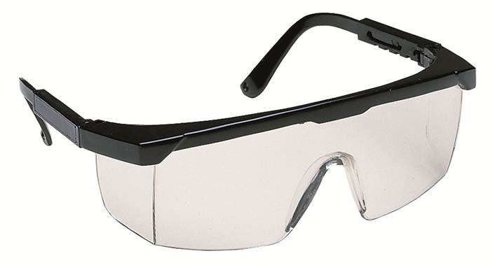 Professionali, lenti trasparenti antigraffio, stanghette regolabili in lunghezza, protezioni laterali.