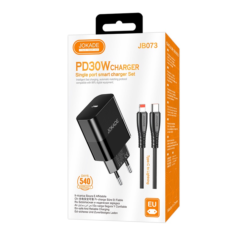 Set di ricarica elegante e funzionale composto da caricatore da parete con porta USB-C e cavo Type-C to Lightning, ideale per ricaricare in modo rapido, stabile e sicuro smartphone e dispositivi compatibili. Il modello JB073 è pensato per offrire praticità nell’uso quotidiano, risultando perfetto a casa, in ufficio o durante gli spostamenti.