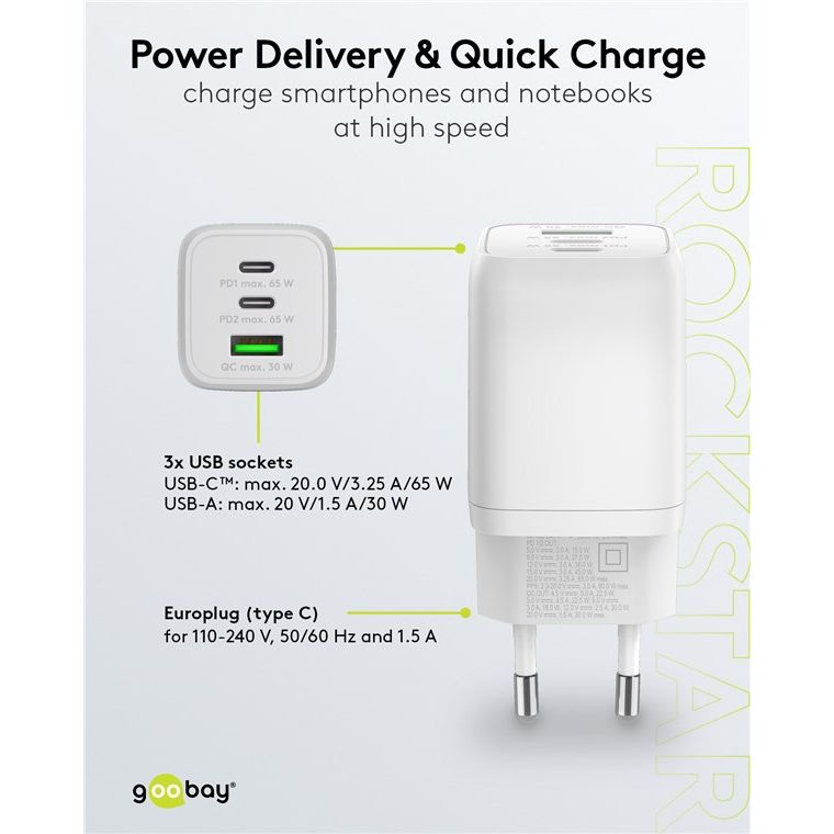 Un design supercompatto, prestazioni potenti, elevata efficienza energetica e v: tutto questo in un unico adattatore di ricarica. L'alimentatore di Goobay è l'alimentatore perfetto a casa e in viaggio e ricarica in modo affidabile e rapido qualsiasi dispositivo, dalle cuffie Bluetooth ai computer portatili. Semplicemente. Tutto. Ciò che serve!