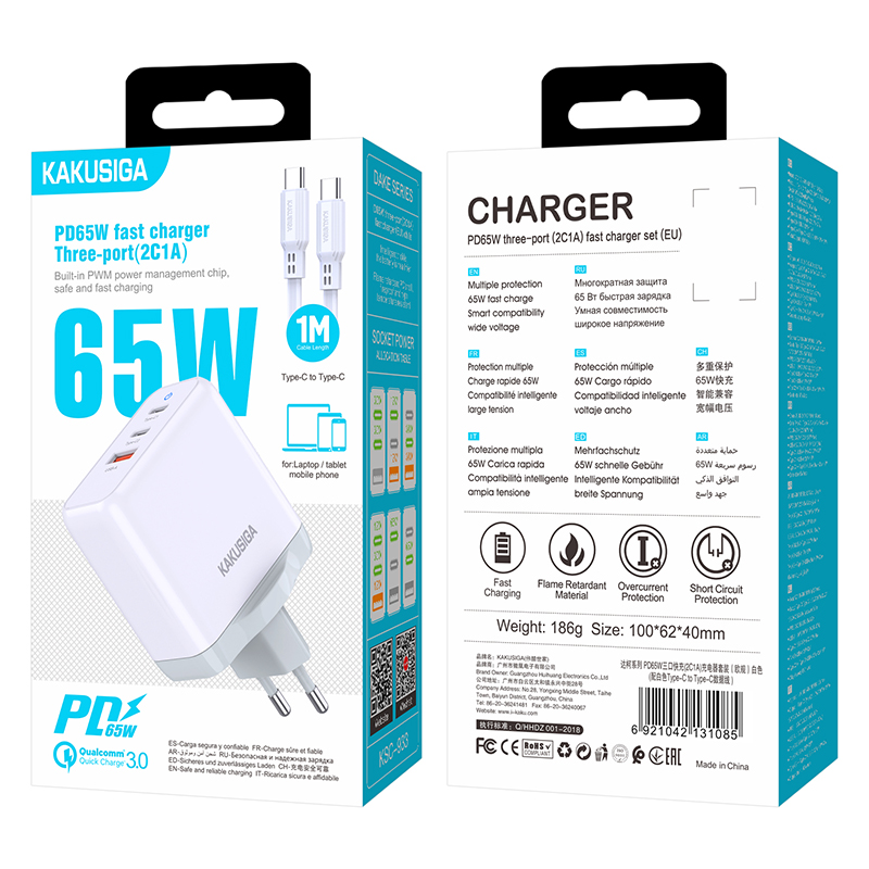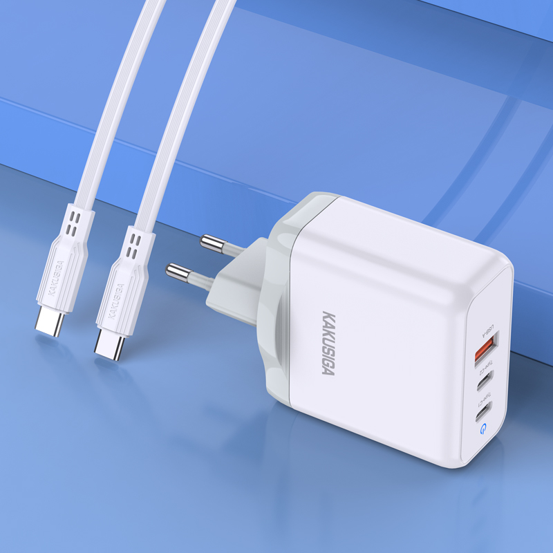 Caricabatterie rapido 65W 2 USB-C + 1 USB-A bianco con cavo Type-C 1m KSC-933