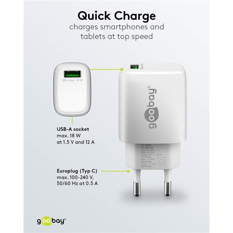 Il caricatore USB di Goobay è dotato di una porta di ricarica rapida USB Quick Charge (QC 3.0).