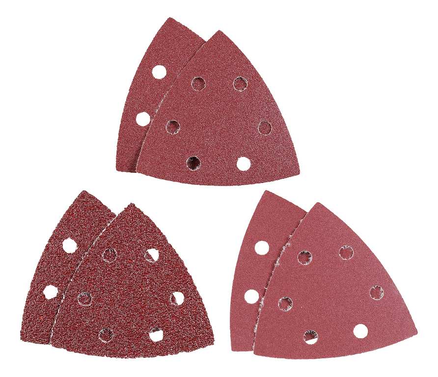 Triangoli abrasivi mm. 96 per legno e metallo, corindone pregiato, con riporto di ossido di alluminio. Composizione: 2 pz. grana 40, 1 pz. grana 120, 2 pz. grana 240.