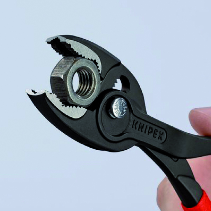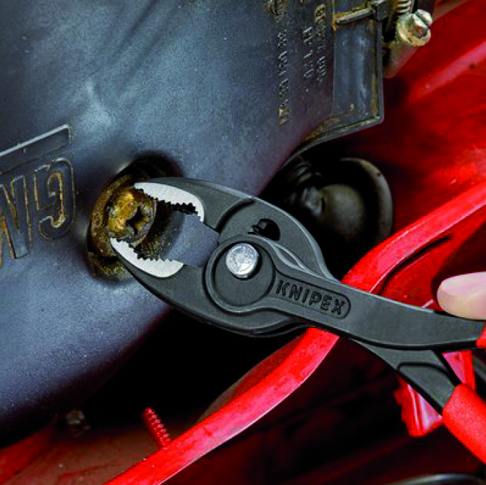 Impugnatura frontale e laterale, manici rivestiti in resina sintetica antiscivolo, cerniera passante, ganascia anteriore con denti robusti, regolazione mediante pulsante. Consente di lavorare anche in spazi ristretti.