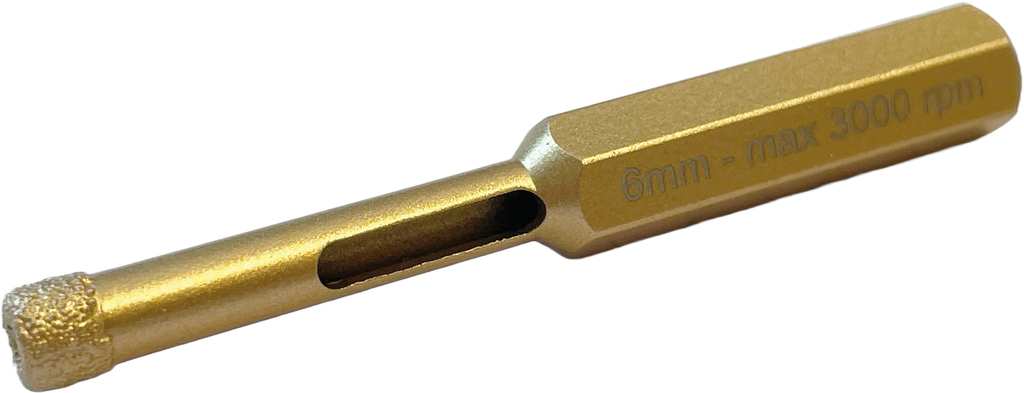 Specifica per gres porcellanato, graniti e ceramiche. Corona continua di diamanti industriali elettro-depositati sulla testa, gambo esagonale mm. 9,5, scarico laterale per lespulsione della carota generata durante il taglio e per il raffreddamento dell'utensile. Utilizzo con acqua per refrigerare.
