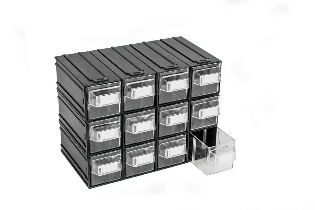 Cassettiera modulare ad incastro in plastica, impugnatura con porta-etichetta, cassetti trasparenti.