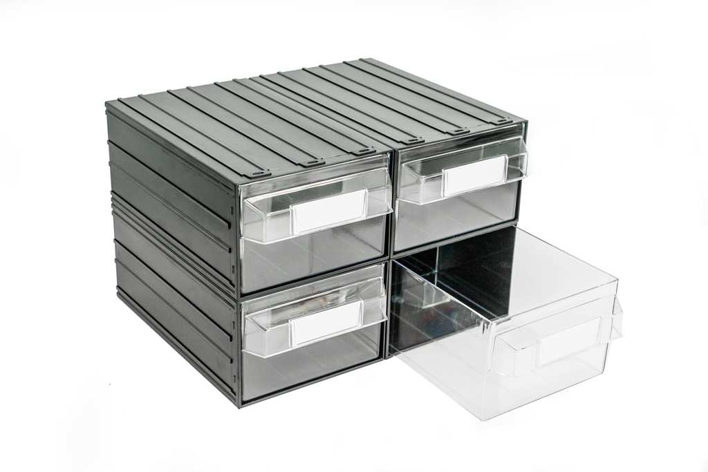 Cassettiera modulare ad incastro in plastica, impugnatura con porta-etichetta, cassetti trasparenti.