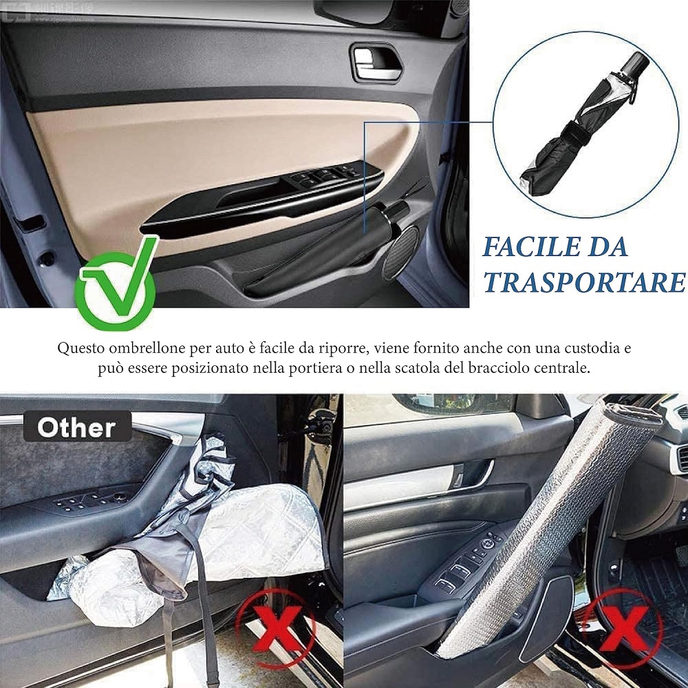 - Il Parasole è progettato con materiali di qualità che riflettono efficacemente i raggi solari e bloccano i raggi UV, proteggendo l’interno del veicolo dal surriscaldamento e preservando la longevità del cruscotto e degli interni dalla decolorazione e dai danni causati dal sole.